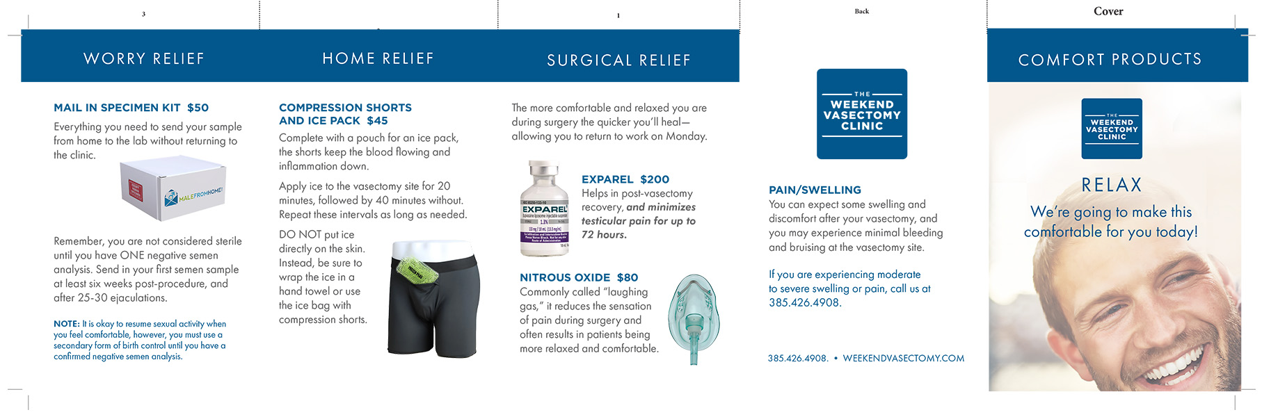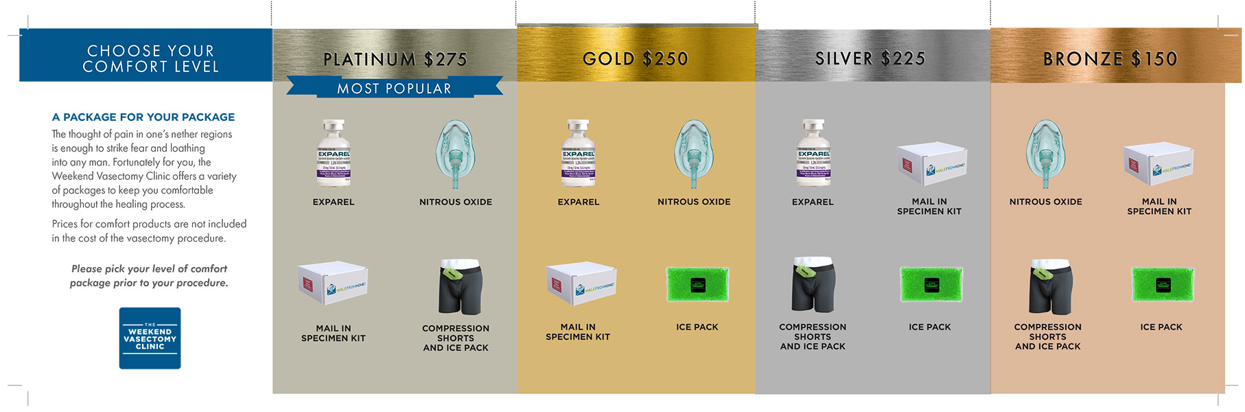 This brochure is given to vasectomy patients when they check in for their procedure. The comfort package brochure is a 3″ x 5″ piece that folds out to 16″ x 5″. Each panel on the interior of the brochure provides the cost and items included in each of the four comfort packages offered by the Weekend Vasectomy Clinic.